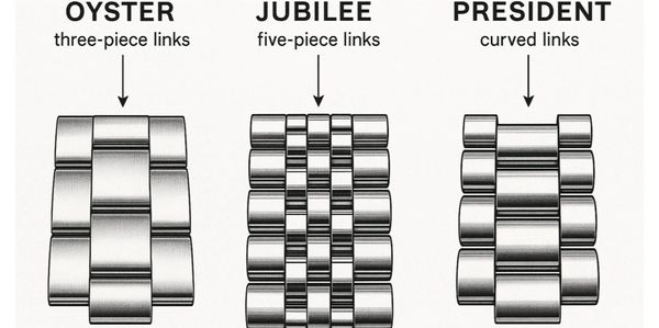 The President bracelet has a three-piece semi-circular link design. The rounded links create a softer, more elegant look compared to the flatter Oyster.